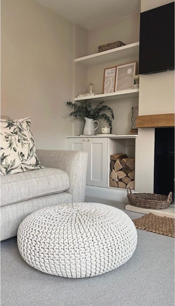 In the living room, place two round knitted poufs across from your main sofa. This creates a “conversational circle” that feels more intimate than a traditional layout. Because they are lightweight, you can easily slide them under a coffee table when you need more floor space.